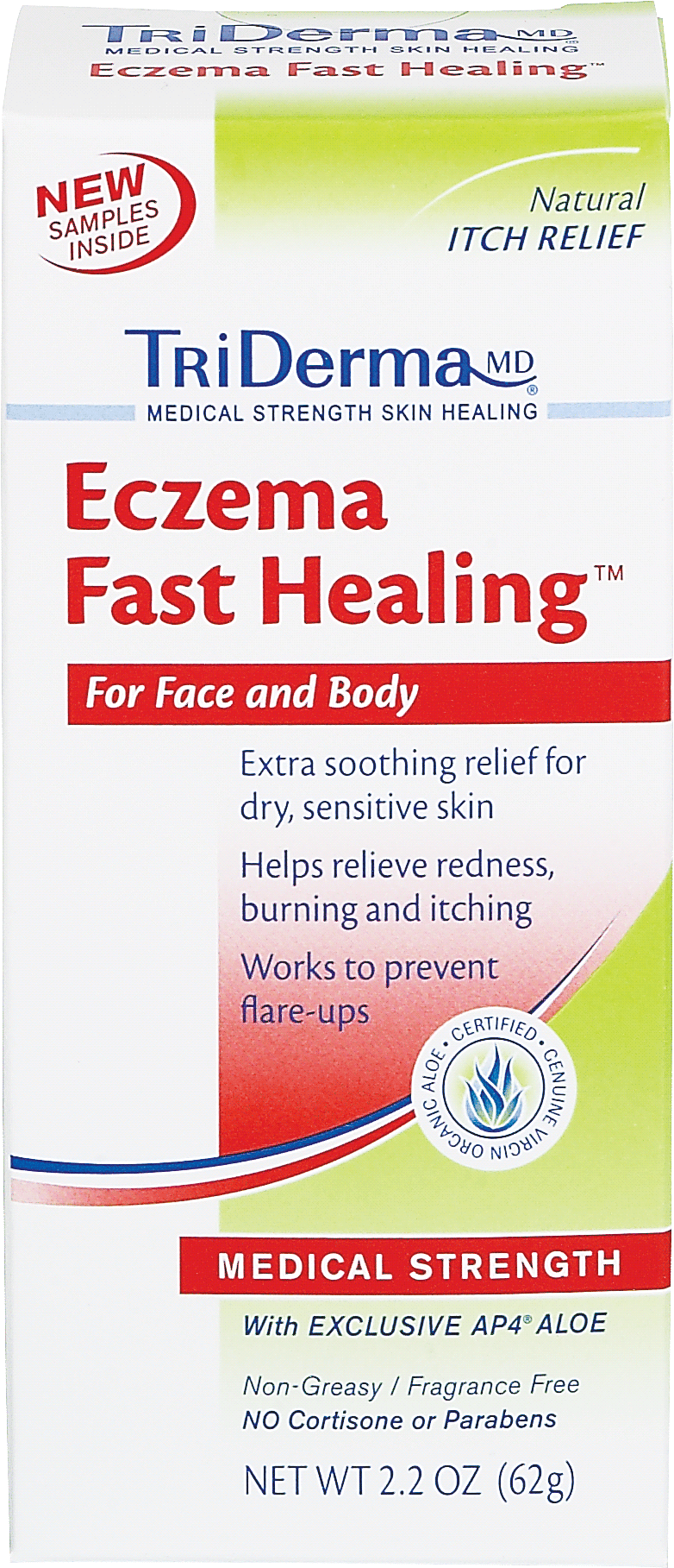 Triderma Eczema Fast Healing. This specialized non-greasy cream combines medical strength ingredients to help provide fast relief for red, irritated, itchy skin from Eczema or other skin irritations caused by chemicals, detergents or excessive hand washings. It contains more than 200 natural healing properties to help promote healing without harmful cortisone or other damaging drugs making it safe for men, women and children.