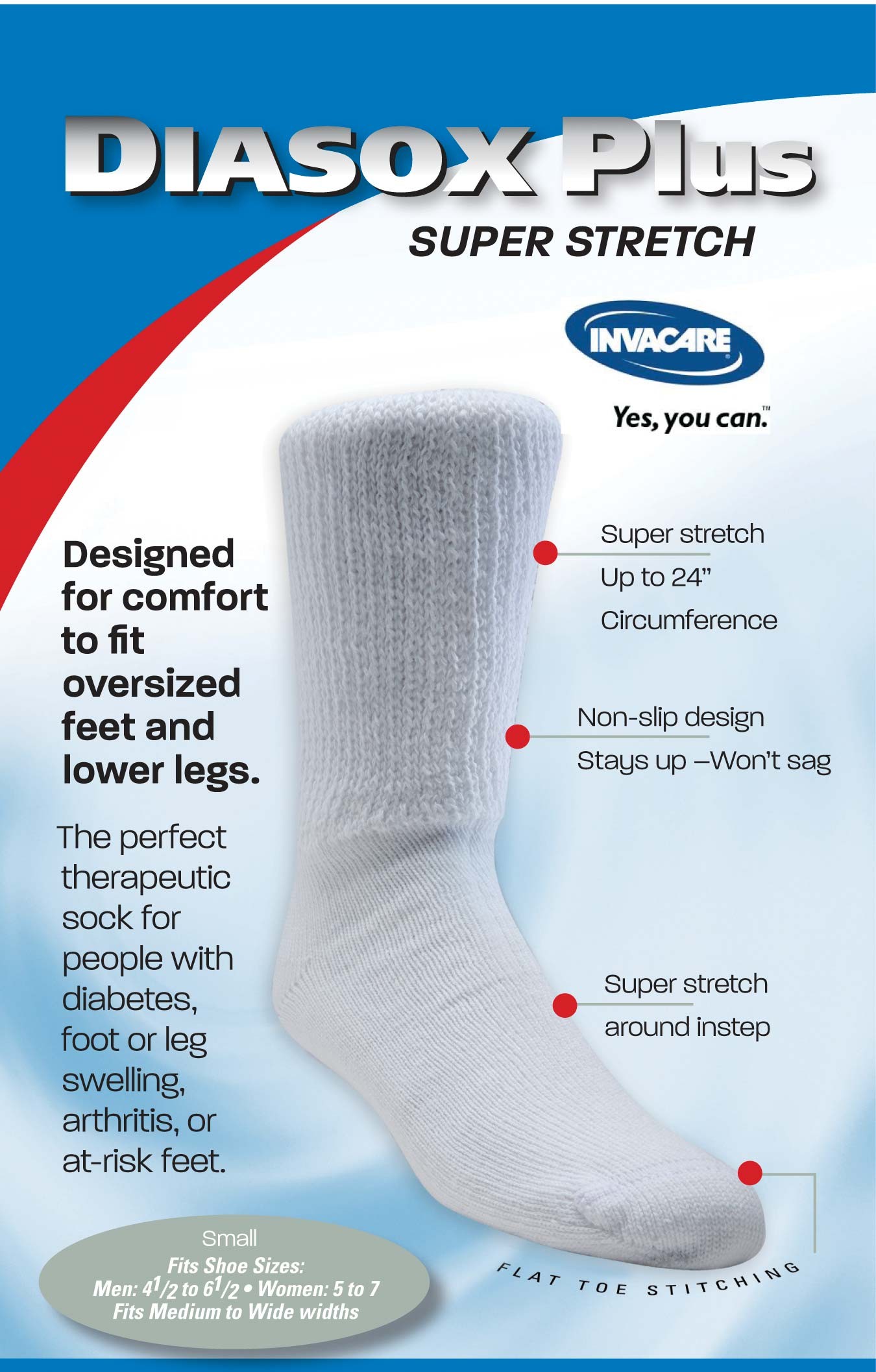 "DiaSox Plus is a Care Sox style sock designed for those individuals with oversized feet and legs and can stretch up to 25"" in circumference. This ultra soft product has antibacterial protection and super soft padding for pressure relief. The Care Sock style sock is perfect for serious edema, heavier people, and as a covering over bandages, dressings or casts. 88% natural cotton/10% nylon/2% Spandex."