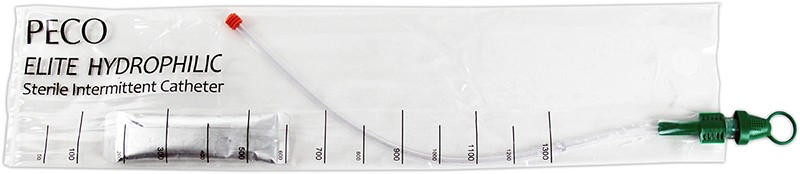 14Fr Peco Elite Hydrophilic Touch free closed catheter system. DEHP, BPA and latex free, sterile, single use. System features polished eyelets, hydrophilic catheter, easy burst water sache, with integrated 1500 ml collection bag.