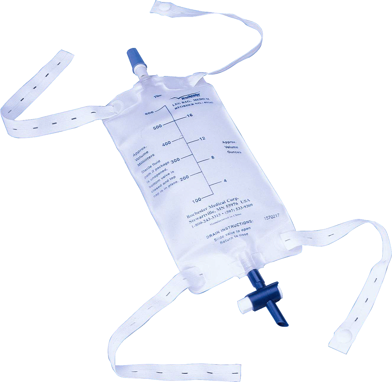 Latex-free leg bags are constructed using high quality welded vinyl seams and an anti-reflux flutter valve and sterile fluid pathway. The easy to operate Secure Glide drainage valve provides security and discreet urine management.
