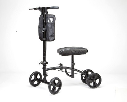 "Steerable Knee Scooter, Steel. Ideal for individuals recovering from foot surgery, breaks, sprains, amputation, and ulcers of the foot. Padded leg pad provides comfort. Durable, steel frame with silver vein finish; Tool free height adjustment. Removable discreet storage pouch with Velcro-lock strapping. 8"" casters are ideal for indoor/outdoor use. Deluxe breaking system. 300 lb weight capacity."