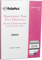 "ReliaMed Transparent Thin Film Adhesive Dressing, Provides an occlusive barrier to moisture and bacteria. Features a high moisture vapor transmission rate and a smooth finish to reduce shear friction to surrounding skin. Beveled edge minimizes edge lift. Ideal for use as a secondary wound dressing. Sterile, 6"" x 8"", Each"