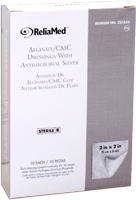 "ReliaMed Silver Alginate/CMC Dressing, 2"" x 2"" Pad. Controlled silver ion release provides a broad spectrum of antimicrobial protection for up to fourteen days. Absorbency and wet strength are key performance indicators. Blend of calcium alginate and carboxymethyl cellulose (CMC) provides excellent gelling and wet strength for one-piece, nontraumatic removal. Sterile, 2"" x 2"". Each"