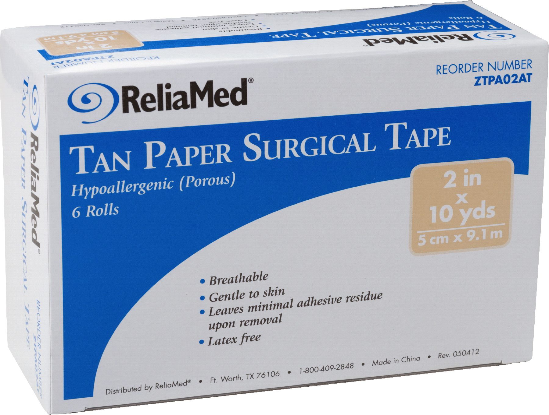 "ReliaMed 2"" x 10 yds. Tape, Paper. Tan, hypoallergenic paper tape for general use. Easy to tear, with a neutral porosity that allows skin to breathe. Ideal for Ostomy patients and situations involving frequent retaping. Latex-free."