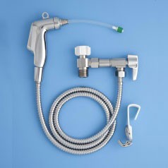 Fixed Water Feed System with stainless steel feeder hose, hooks to commode. Shut off valve which screws on pressure fitting, redesigned palm wand and hanger.