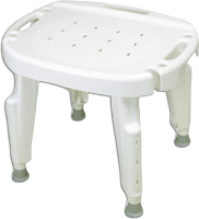 Bath safe adjustable shower seat without arms, without back, weight capacity 300 lbs. Seat width: 22", width between arms: 17 1/2". Width of bench at legs: 17".