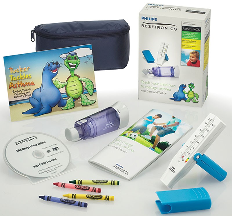 Asthmapack for children. Each AsthmaPACK combination includes a low range peak flow meter, opti chamber, instructional DVD, and educational self-help booklet and crayons .