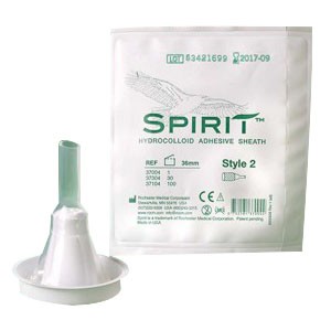 Spirit style 2 hydrocolloid sheath latex-free male external catheter, x-large 41 mm. Combines adhesive and moisture-wicking properties of hydrocolloid with the breathability and flexibility of silicone. Offers built-in adhesive in a length and placement found with traditional male external catheters. The soft, breathable sheath conforms to the skin.
