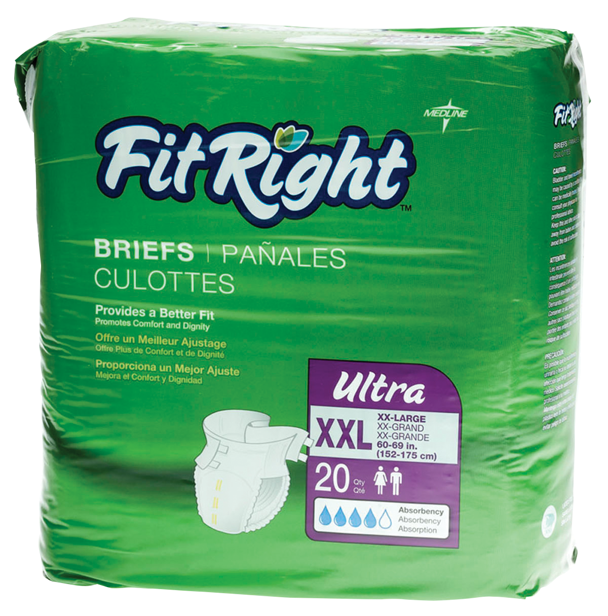FitRight ultra briefs promote a better fit as well as comfort and dignity. 4D core with odor protection helps wick fluid away to promote dryness and help maintain skin integrity. Soft anti-leak guards help to reduce leakage and improve containment. Skin-safe closures provide secure, safe and repeated refastenability. Ultra-soft cloth-like backsheet provides a discreet, garment-like, natural feel. Plus absorbency core and breathable side panels increase airflow and maximize patient comfort. Moisture alert wetness indicator changes color when the garment has been soiled.