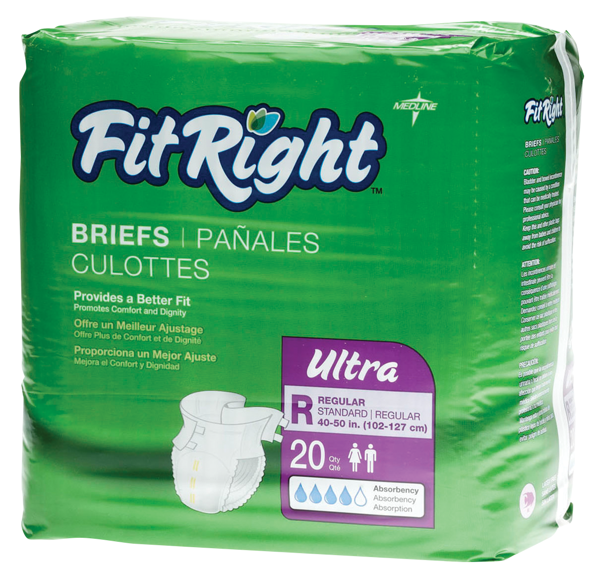 FitRight ultra briefs promote a better fit as well as comfort and dignity. 4D core with odor protection helps wick fluid away to promote dryness and help maintain skin integrity. Soft anti-leak guards help to reduce leakage and improve containment. Skin-safe closures provide secure, safe and repeated refastenability. Ultra-soft cloth-like backsheet provides a discreet, garment-like, natural feel. Plus absorbency core and breathable side panels increase airflow and maximize patient comfort. Moisture alert wetness indicator changes color when the garment has been soiled.
