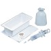 70cc piston syringe and graduated flask packaged in basin with peel-back lid. Single-use, sterile